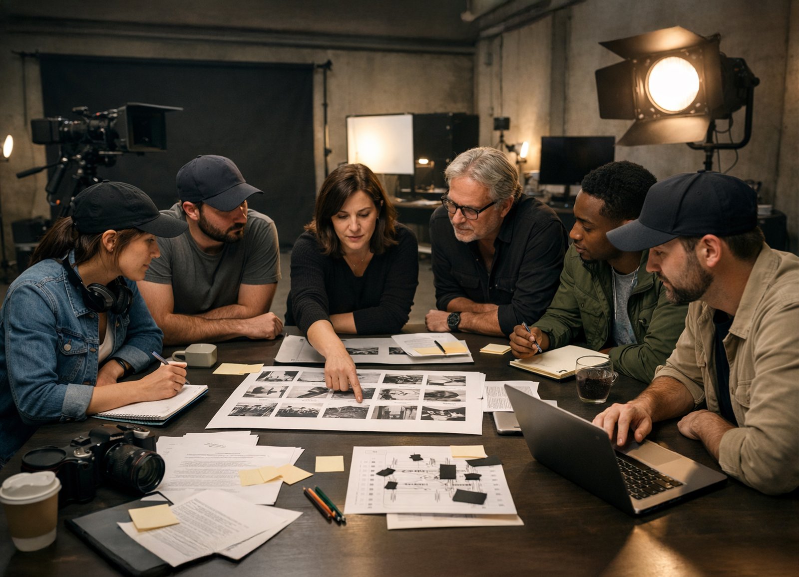 team brainstorming, creative concept boards, cinematic top-down shots, cinematic lighting, moody, professional.